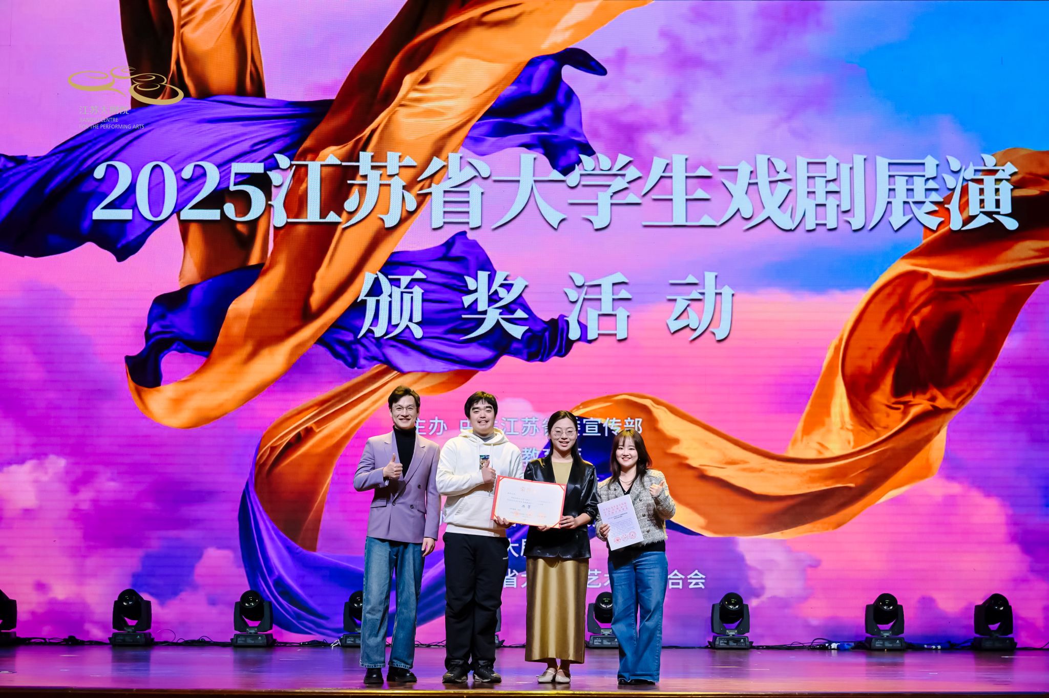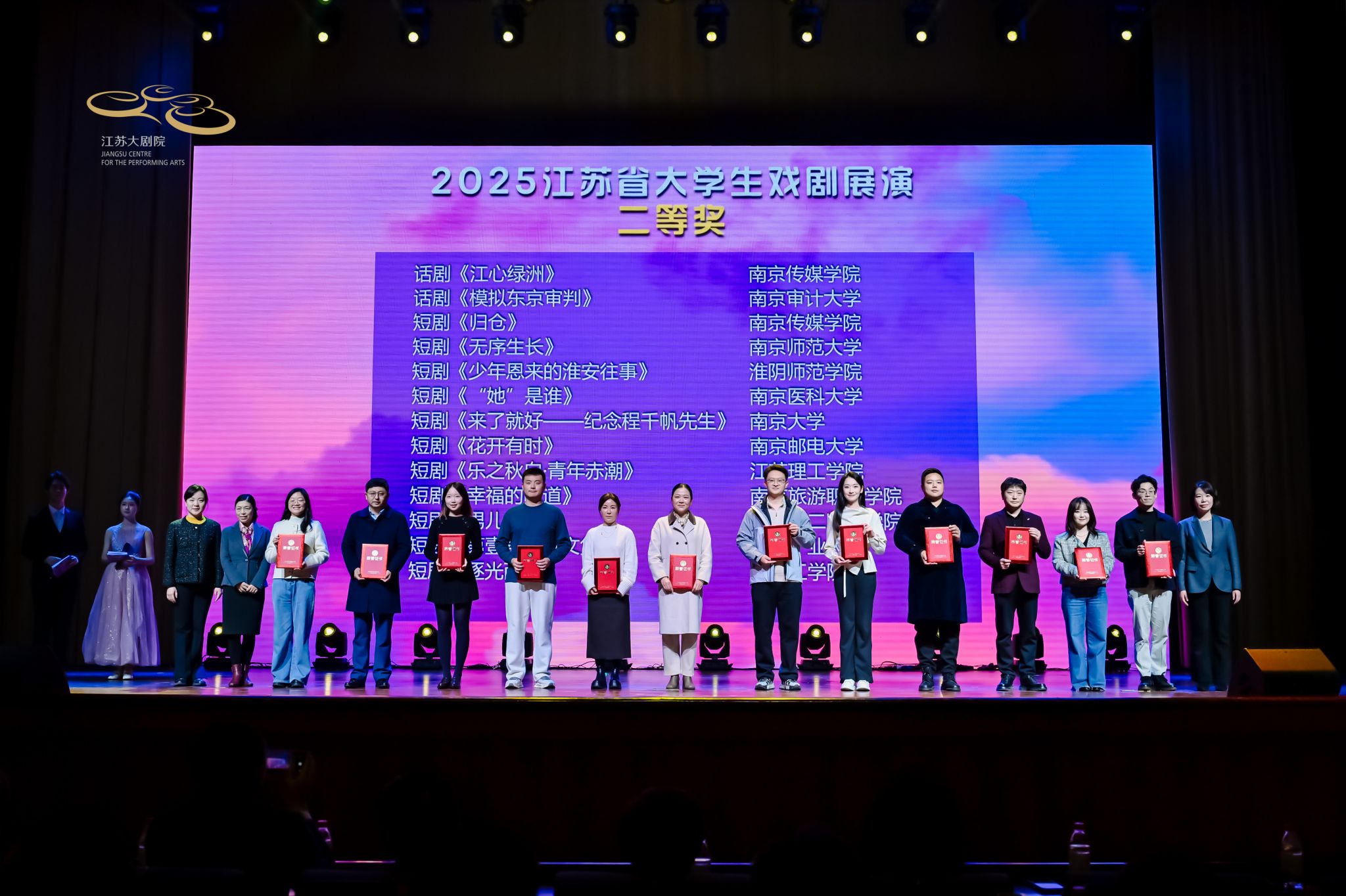 12月30日,由中共江苏省委宣传部、江苏省教育厅、共青团江苏省委主办,江苏省戏剧家协会、江苏大剧院、江苏省大学生艺术团联合会承办的2025江苏省大学生戏剧展演颁奖仪式在江苏大剧院国际报告厅隆重举行,我校作品《来了就好——纪念程千帆先生》荣获短剧赛道二等奖。